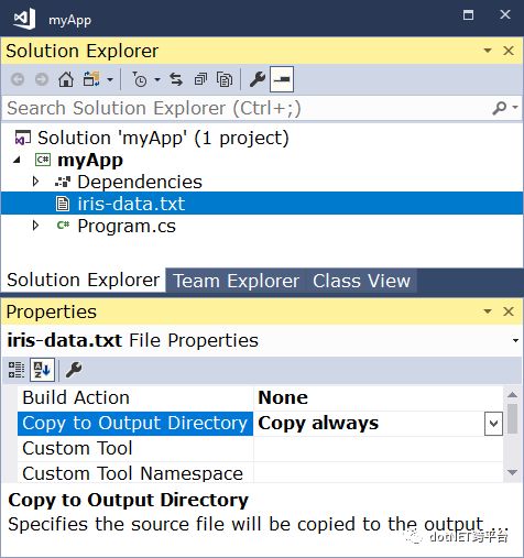 如果是使用了Visual Studio,将iris-data.txt添加至项目中,需要进行如下配置确保运行时数据集文件在输出的目录中。
