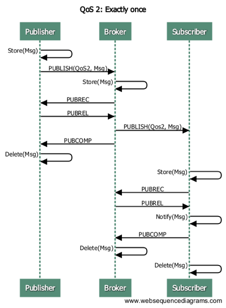 只有一次的传输 在QoS level 1上附加的协议流保证了重复的消息不会传送到接收的应用。这是最高级别的传输,当重复的消息不被允许的情况下使用。这样增加了网络流量,但是它通常是可以接受的,因为消息内容很重要。 QoS level 2在消息头有Message ID。