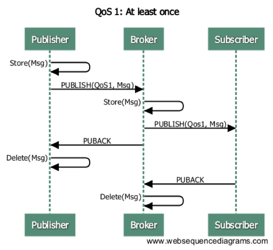 至少一次的传输 服务器接收到消息会被确认,通过传输一个PUBACK信息。如果有一个可以辨认的传输失败,无论是通讯连接还是发送设备,还是过了一段时间确认信息没有收到,发送方都会将消息头的DUP位置1,然后再次发送消息。消息最少一次到达服务器。SUBSCRIBE和UNSUBSCRIBE都使用level 1 的QoS。 如果客户端没有接收到PUBACK信息(无论是应用定义的超时,还是检测到失败然后通讯session重启),客户端都会再次发送PUBLISH信息,并且将DUP位置1。 当它从客户端接收到重复的数据,服务器重新发送消息给订阅者,并且发送另一个PUBACK消息。