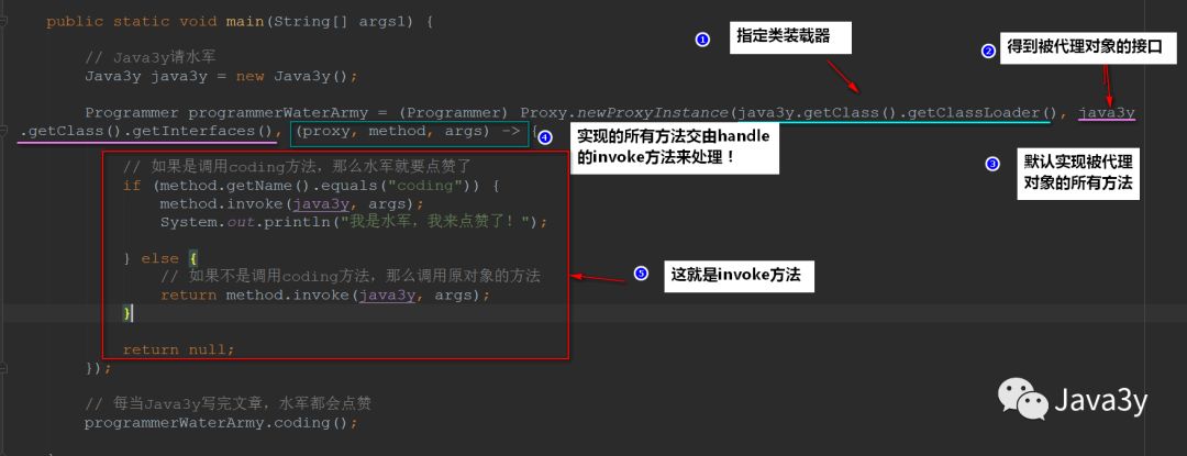 Programmer programmerWaterArmy = (Programmer) Proxy.newProxyInstance(java3y.getClass().getClassLoader(), java3y.getClass().getInterfaces(), (proxy, method, args) -> {