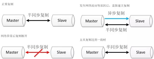 半同步复制由于发生超时后,复制断开,当再次建立起复制时,同时建立两条通道,其中一条半同步复制通道从当前位置开始复制,保证从机知道当前主机执行的进度。另外一条异步复制通道开始追补从机落后的数据。当异步复制通道追赶到半同步复制的起始位置时,恢复半同步复制。