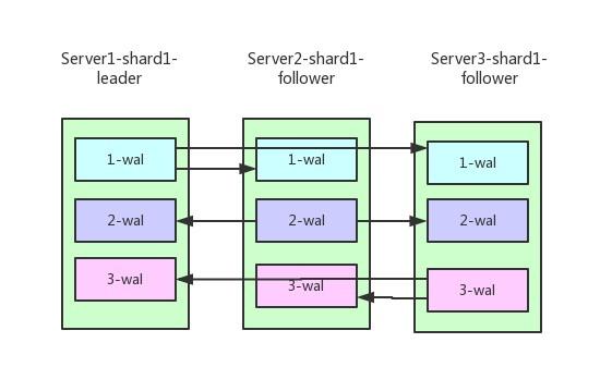 当前Server1是该shard的Leader接受Client的写入,Server2和Server3都是Follower接受Server1的复制请求,此时1-wal通道作为当前的数据写入通道, Server2和Server3此时可能落后于Server1。