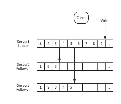 假如此时Server1挂了,从Server2和Server3中选出新的Leader,如此时选为Server2为Leader。