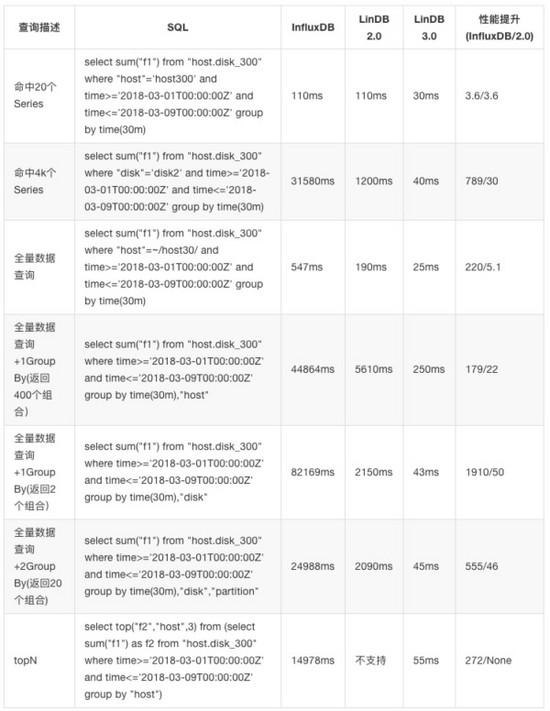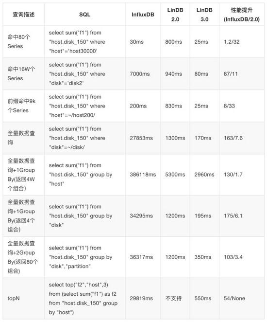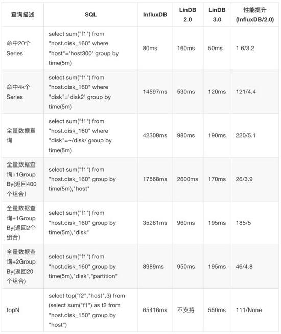 下面是与InfluxDB和LinDB2.0的一些查询性能对比。 由于InfluxDB集化要商业版,所以都是单机默认配置下,无Cache的测试。 服务器配置阿里云机器:8 Core 16G Memory