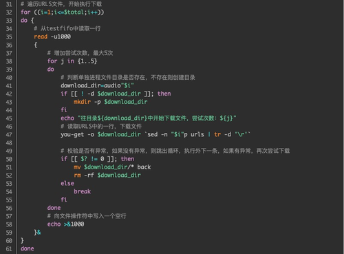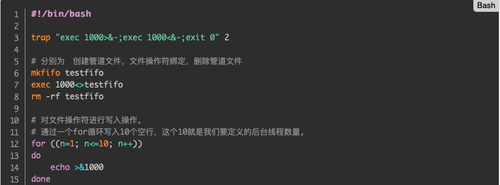 $total个任务($total是变量,是读取的urls的总行数,值大于0),我们需要保证后台只有10个进程在同步运行(当然这段代码有点小遗憾,就是未能根据总行数决定用多少个进程,加入总行数小于10,但我们创建了10行空字符串,但这并不影响我们的测试) 。 read -u1000的作用是:读取一次管道中的一行,在这儿就是读取一个空行。- 减少操作附中的一个空行之后,执行一次任务(当然是放到后台执行),需要注意的是,这个任务在后台执行结束以后会向文件操作符中写入一个空行,这就是重点所在,如果我们不在某种情况某种时刻向操作符中写入空行,那么结果就是:在后台放入10个任务之后,由于操作符中没有可读取的空行,导致