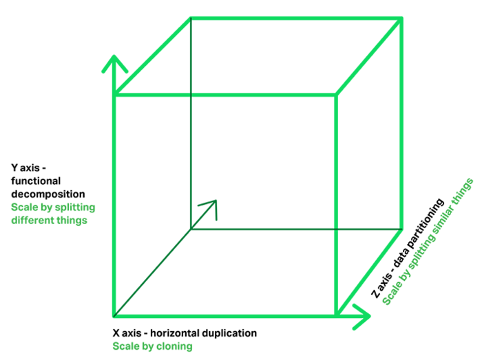 用《The art of scalability》一书里提到的scale cube比较容易理解如何拆分。你看,我们叫分库分表,别人总结成了scale cube,这就是抽象的能力啊,把复杂的东西用最简单的概念解释和总结。X轴代表运行多个负载均衡器之后运行的实例,Y轴代表将应用进一步分解为微服务 (分库),数据量大时,还可以用Z轴将服务按数据分区(分表)