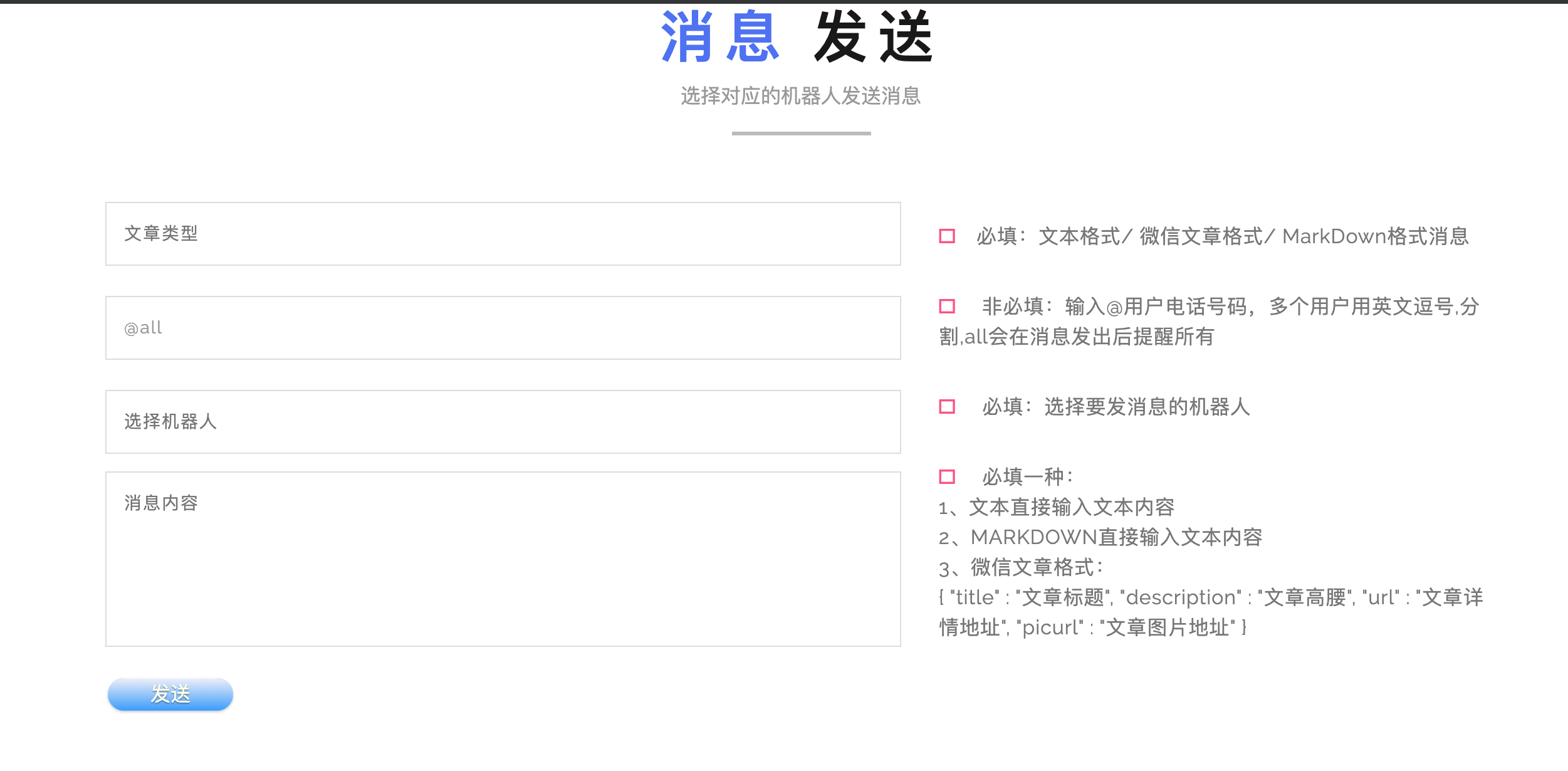 基于flask做了web的封装,可以发送文本、markdown、微信文章类型的消息,提供了ui的发送消息的方式,同时也提供了接口访问。
