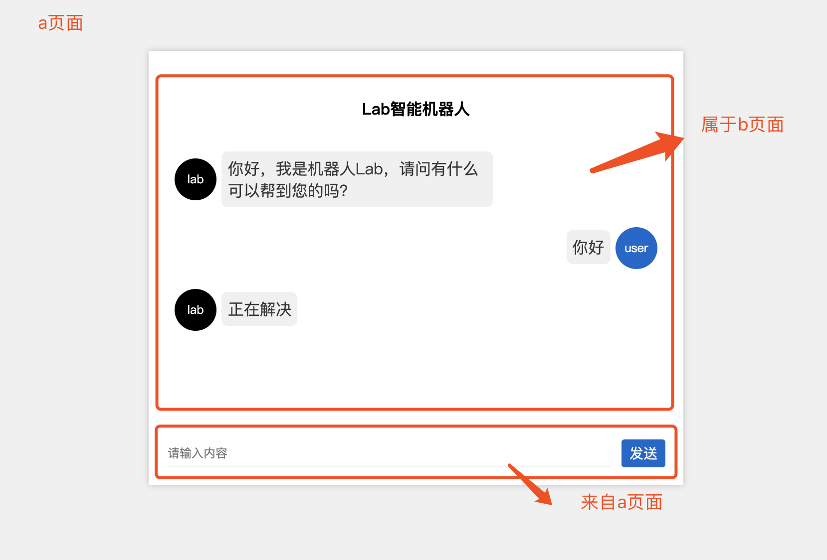 首先我们在a页面通过发送按钮和输入框将消息发送给b页面,大致结构如下: