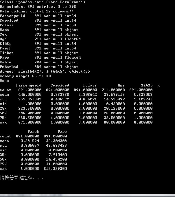 用info函数来查看数据缺失信息。这艘船共有891个乘客,每个乘客都有12个属性。其中Age只有714个人有信息,缺失177个数据,而Cabin(客舱)则只有204个数据。