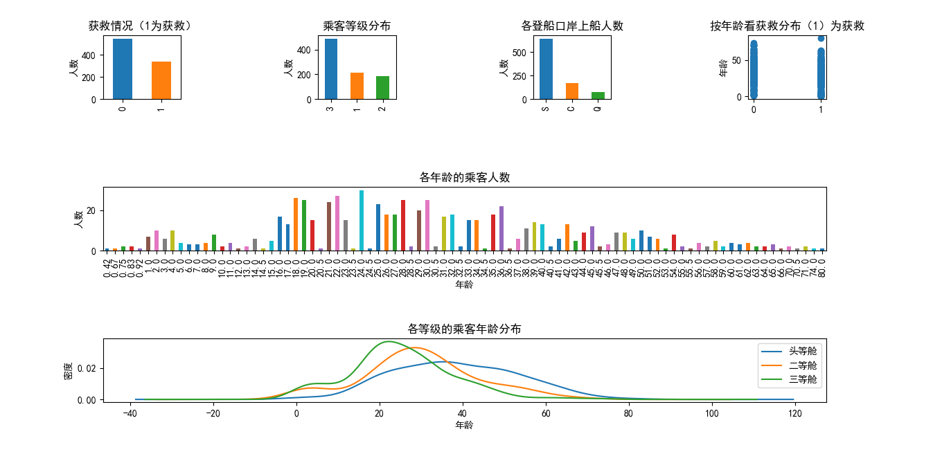 plt.show() 综上所述,对于乘客的获救情况,我们大致可以得出以下结论: