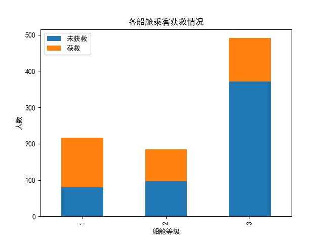 # df5=pd.DataFrame({'获救':survived_1_three,'未获救':survived_0_three})