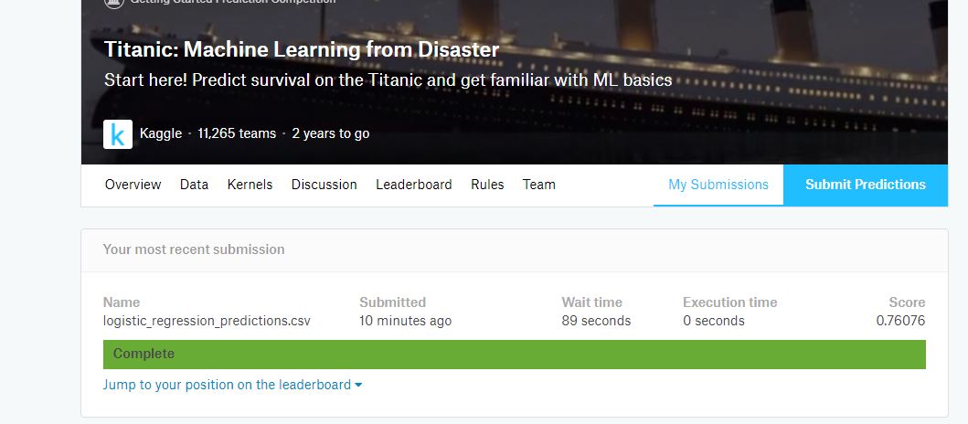 最后就是在kaggle上提交自己的结果,我的评分为0.76076。