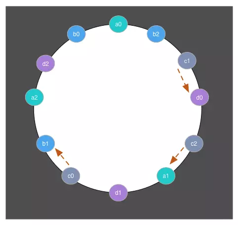 也就是a,b,c,d的虚拟节点a0,a1,a2,b0,b1,b2,c0,c1,c2,d0,d1,d2散落在圆环上,假设C号节点down,则c0,c1,c2的压力分别传给d0,a1,b1,如下图