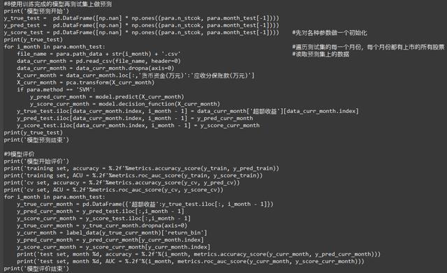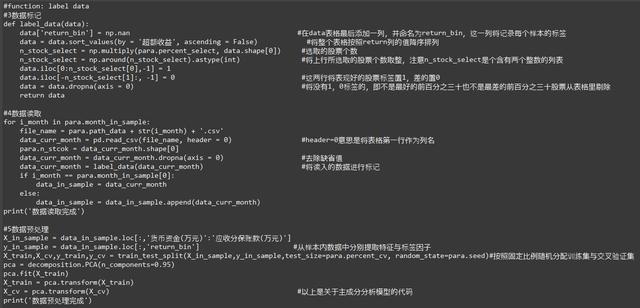 将数据读取到DataFrame表格里后,并不是全部使用,而是取超额收益值最好的前百分之三十,以及最差的后百分之三十,并在表格后追加一列,列名叫return_bin,将最好最差的百分之三十的股票的return_bin列各赋值1,0。然后将每个读取并加工的excel表格拼接在一起形成一个大表格,从总抽取70个因子作为X_in_sample,抽取return_bin作为y_in_sample作为训练集。