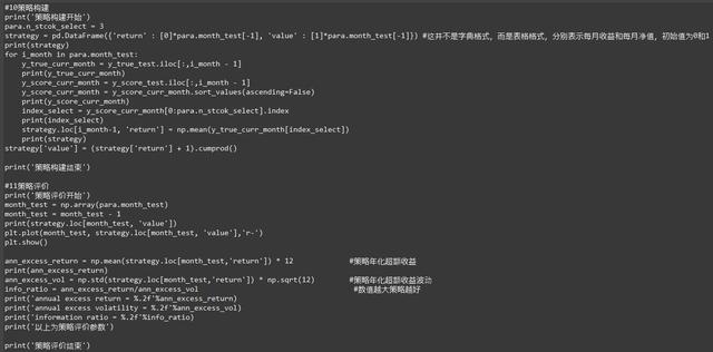 所谓策略构建就是选择什么样的股票,代码里将股票按照超额收益率进行排序,然后我设置para.n_stcok_select = 3意思就是选择超额收益率前三名进行购买。