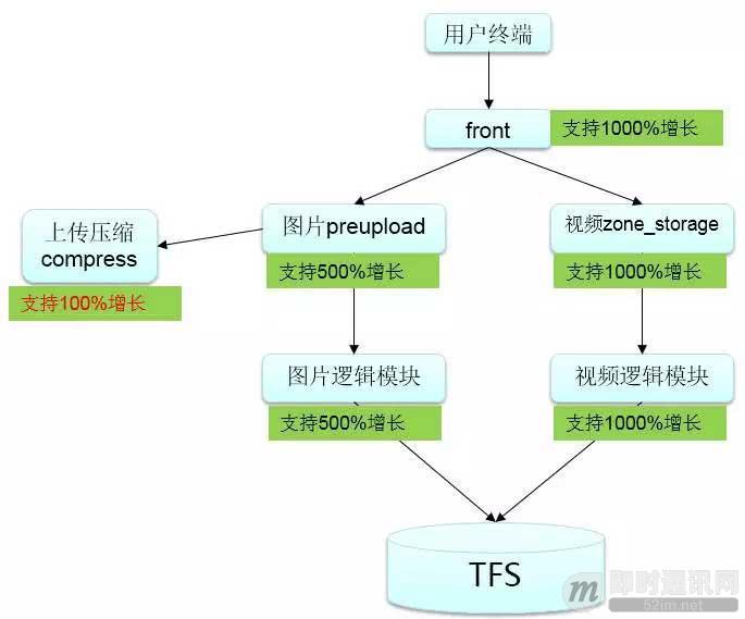 朋友圈业务的主要增长与瓶颈:从前文的设备负载评估图看,在预算范围内,接入层和逻辑层都只能支撑5倍增长,而压缩compress模块只能支撑1倍增长。