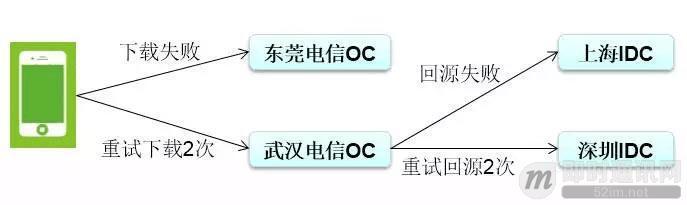 不管是用户到OC的下载过程,还是OC到IDC的回源过程,默认都会进行2次失败后的重试,并且重试一定会选择异地的接入点,避免继续重试到故障的节点。实现的原理是每一层master都会返回给前端至少两组ip列表,并保证两组ip列表为异地节点,前端失败时才可以实现异地重试。