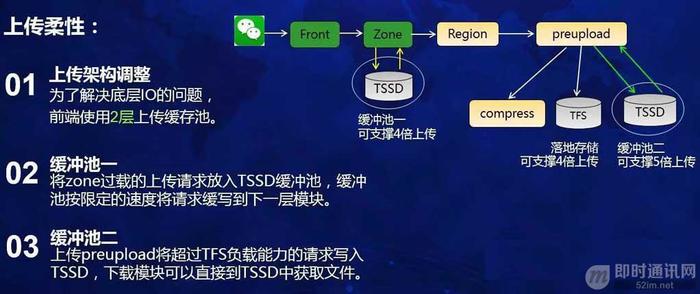 由于上传preupload接口机及后层的逻辑模块等,都无法支持10倍涨幅。所以在架构中另外搭建了两套TSSD缓冲池,缓冲池用于临时存储新上传的文件,可以支持读写。按上图所示,在zone模块处增加了缓冲池一,在上传preupload处,增加了缓冲池二。两个缓冲池的作用是有区别的: