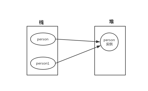 我们将 person 对象复制给了 person1 对象,我们对 person1 对象的 name 属性进行了修改,并未修改 person 对象的name 属性值,但是我们最后发现 person 对象的 name 属性也发生了变化,其实不止这一个值,对于其他值也是一样的,所以这结果证明了我们上面的结论:直接赋值的方式没有生产新的对象,只是生新增了一个对象引用,直接赋值在 Java 内存中的模型大概是这样的