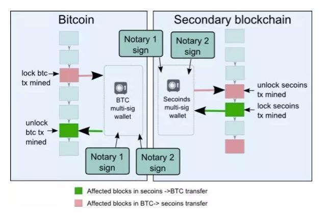 联盟模式是使用公证人联盟来取代单一的保管方,利用公证人联盟的多重签名对侧链的数字资产流动进行确认。在这种模式中,如果要想盗窃主链上冻结的数字资产就需要突破更多的机构,但是侧链安全仍然取决于公证人联盟的诚实度。图2给出了以比特币为主链的联盟模式的工作示意图:
