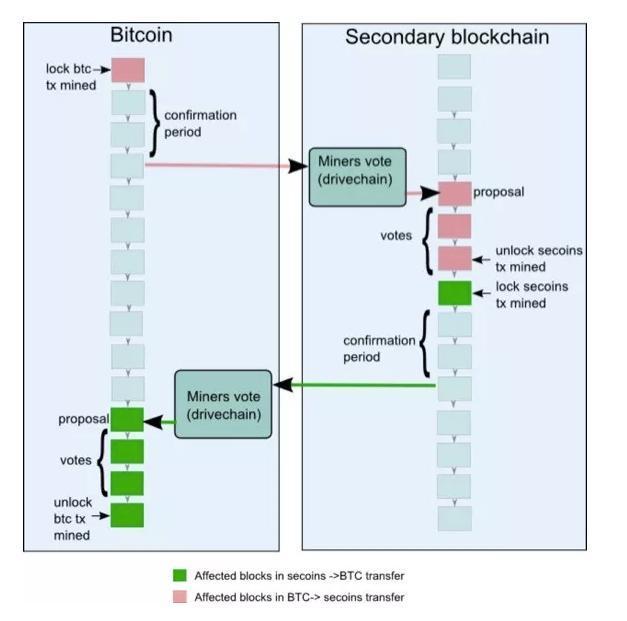 驱动链概念是由Bitcoin Hivemind创始人Paul Sztorc提出的。在驱动链中,矿工作为‘算法代理监护人’,对侧链当前的状态进行检测。换句话说,矿工本质上就是资金托管方,驱动链将被锁定数字资产的监管权发放到数字资产矿工手上,并且允许矿工们投票何时解锁数字资产和将解锁的数字资产发送到何处。矿工观察侧链的状态,当他们收到来自侧链的要求时,他们会执行协调协议以确保他们对要求的真实性达成一致。诚实矿工在驱动链中的参与程度越高,整体系统安全性也就越大。如同SPV侧链一样,驱动链也需要对主链进行软分叉。图4给出了以比特币为主链的驱动链模式的工作流程示意图: