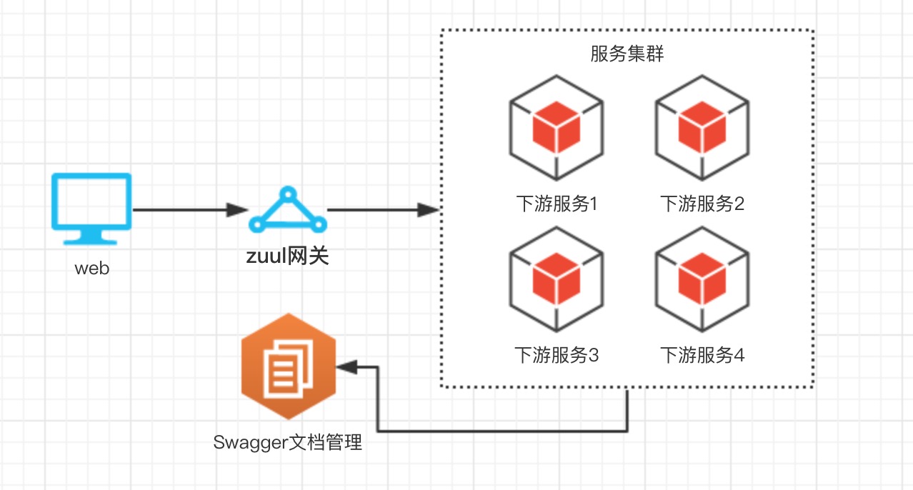 首先介绍一下Zuul如何整合下游服务swagger,很好理解,就是通过Zuul的swagger地址,实现将下游服务的swagger都放入同一个页面内,流转图如下: