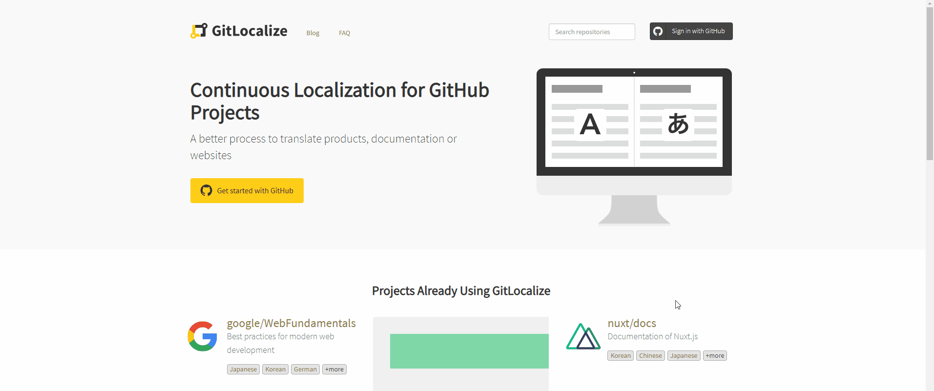 这篇文章里,我给大家介绍一款免费好用的工具:GitLocalize,它能帮我们摆平上面遇到的所有问题!GitLocalize 的网址是:https://gitlocalize.com/ ,我们通过 GitHub 登录并授权应用即可。