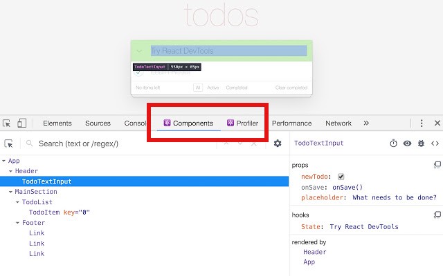 安装完成后,打开Chrome的开发人员工具你就能看到多出了Components和Profiler选项卡,“Components”选项能帮助你查看屏幕上组件列表以及从其他组件派生出的子组件,你能够选择检查甚至编辑组件的状态和属性。使用“Profiler”选项卡,你也可以评估应用程序的性能。