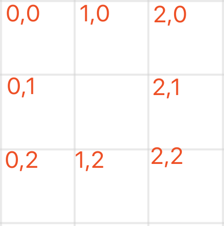 由上图我们可以知道,一个九宫格的4条边,可以用以上8个坐标收尾连接起来,那么我们可以基于这个规律.来生成环形坐标集合.代码如下: