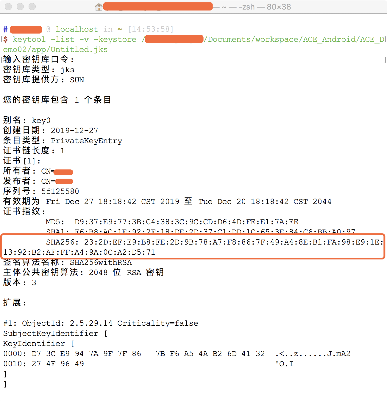 - 【终端】-> keytool -list -v -keystore <key 文件> 即可;