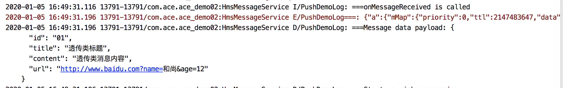 华为透传类消息通过继承的 HmsMessageService 接收,在 onMessageReceived 方法中进行内容的解析,在后台发送时可以设置固定的 key-value 方式也可以设置自定义参数,小菜采用更通用的自定义消息内容方式,组织一个 json 串进行解析;