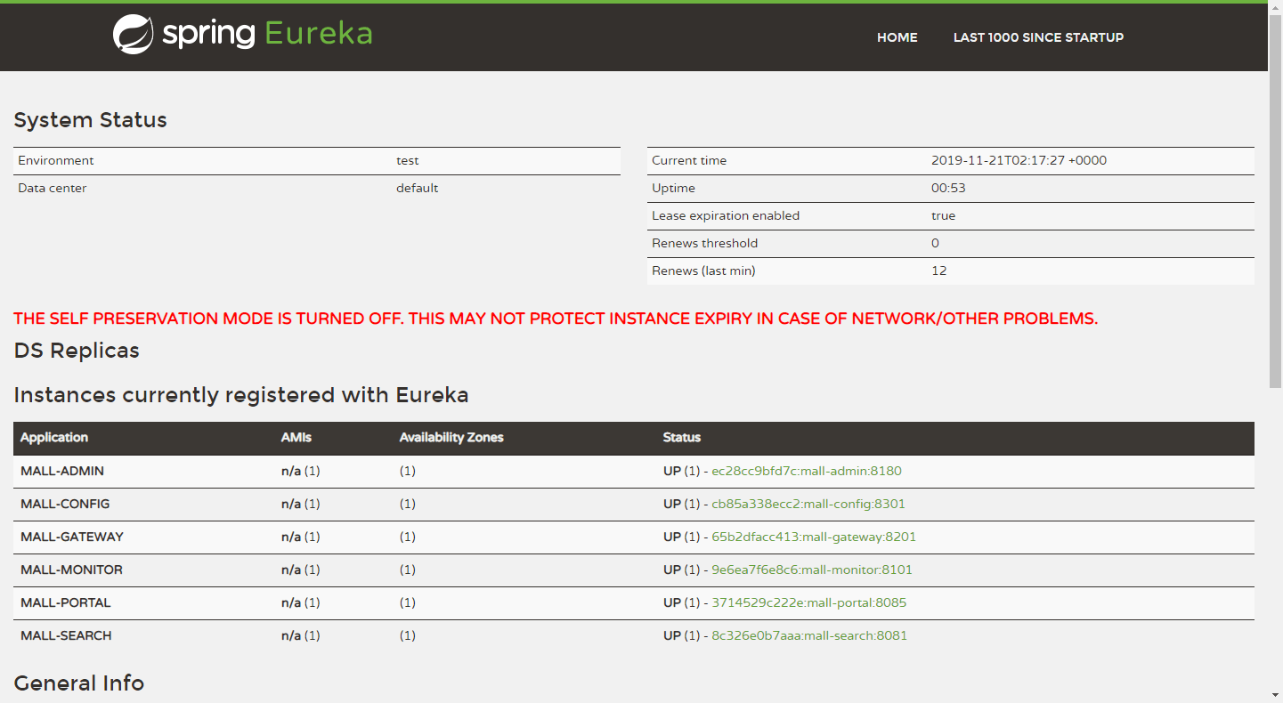 - 运行成功后,通过访问该地址可以查看注册中心控制台:http://192.168.6.132:8001/