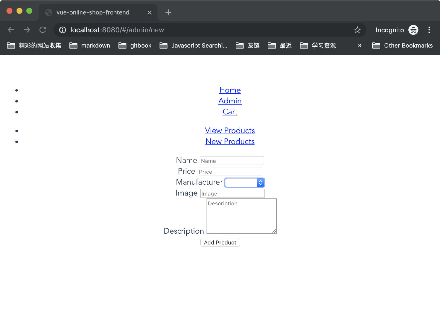 当保存上面编写的代码之后,我们打开浏览器,点击导航链接 Admin,然后点击子导航链接 New Products,切换到我们的 New.vue 添加商品页面,我们可以看到如下的效果: