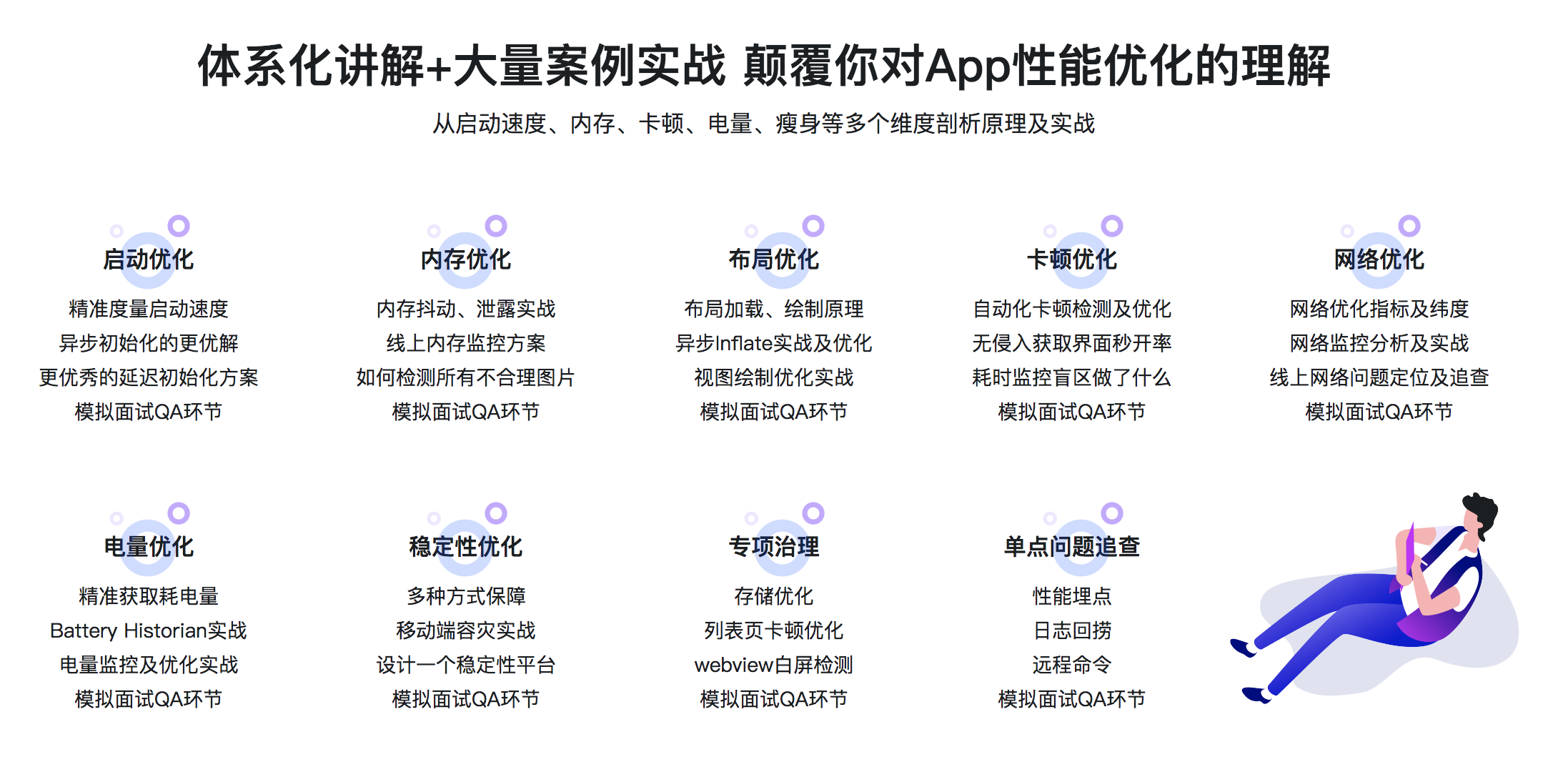 这是一门全方位深层次分析与优化App性能的课程,我会结合实例对App的启动速度、内存、卡顿、布局、电量、流量、稳定性、瘦身等多个纬度进行全方位的分析与实战。另外这门课还有另外一个优势:就是大家会学习到体系化的App性能建设方案。其中的很多知识是你从一般的资料中从来不会想到的,课程中的技能点更是会超过很多面试官的知识范畴。