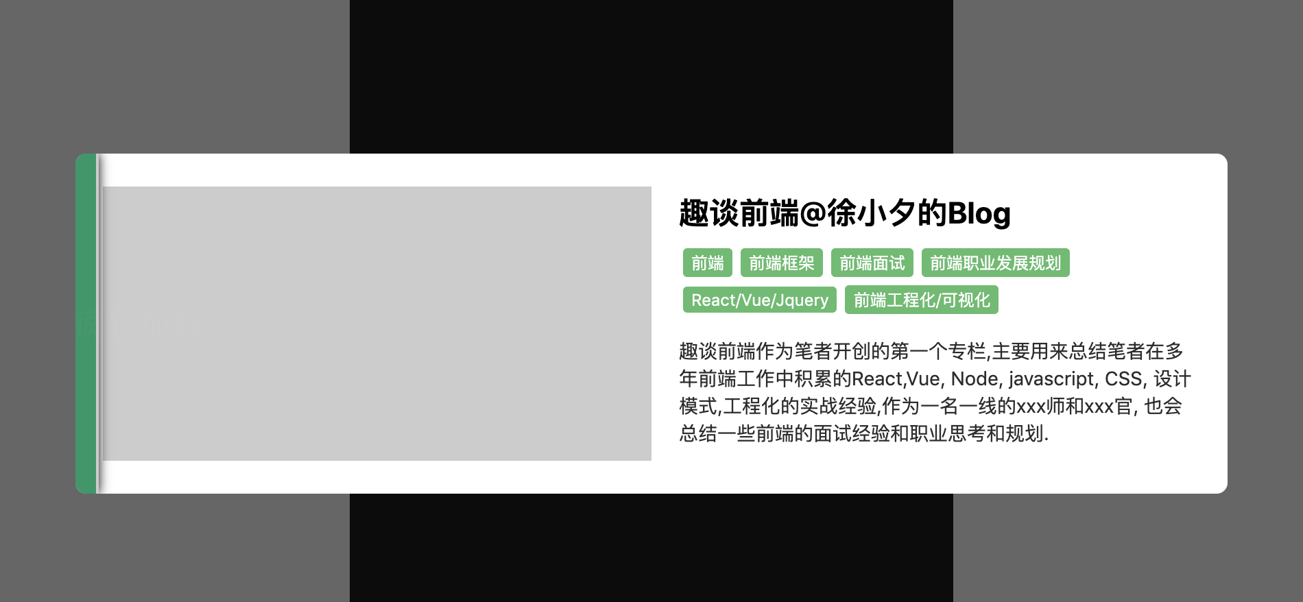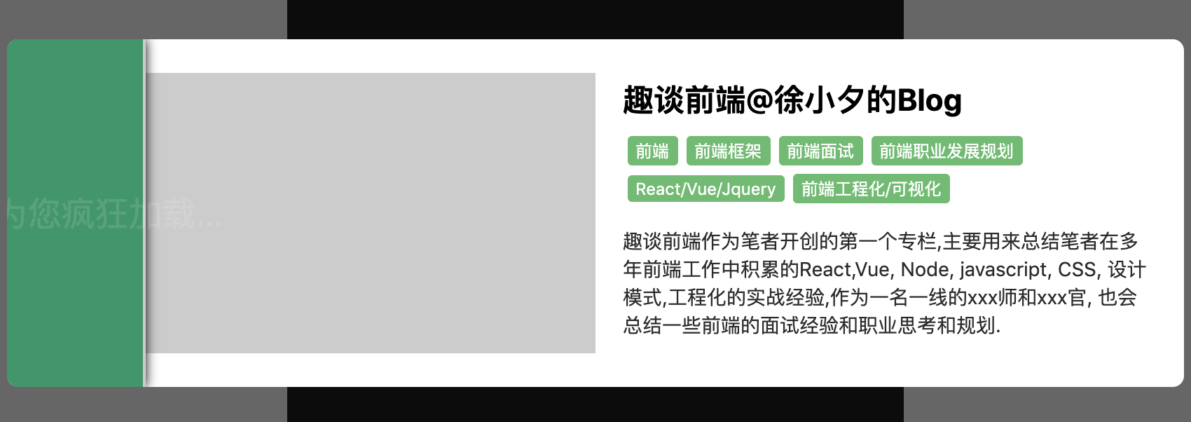 而加载动画一般会分为策略型加载动画和通用加载动画,通用加载动画我就不说了,大家平时做的系统大部分应该都是通用型加载动画. 我这里介绍一下策略型加载动画: 策略型加载动画往往用在C端产品或者系统中,用来为用户提供更多的引导信息, 当用户首次访问系统或者网站时, 由于某种主动型引导(网站在加载时或者切换页面时故意给用户看到的加载信息)或者环境原因(网络,带宽限制导致的加载过慢,此时出现加载动画), 这些加载信息往往带有某种用途,比如对于个人博客网站, 这个加载动画可以是博主的介绍,博主的宣传信息,github地址等, 对于企业来说,可能是某个新功能的介绍, 网站服务信息的介绍,联系方式等.