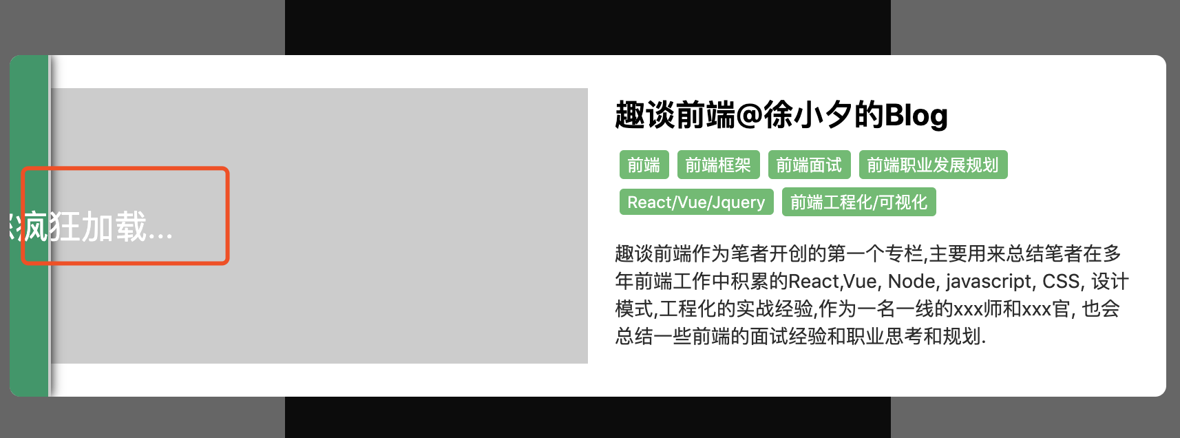 自定义的引导内容这里我就不介绍了, 主要根据不同的网站性质灵活配置.我主要介绍加载动画部分, 其实原理也很简单, 我们在skeletonContent元素上使用一个::after伪对象来实现窗帘动画即可.