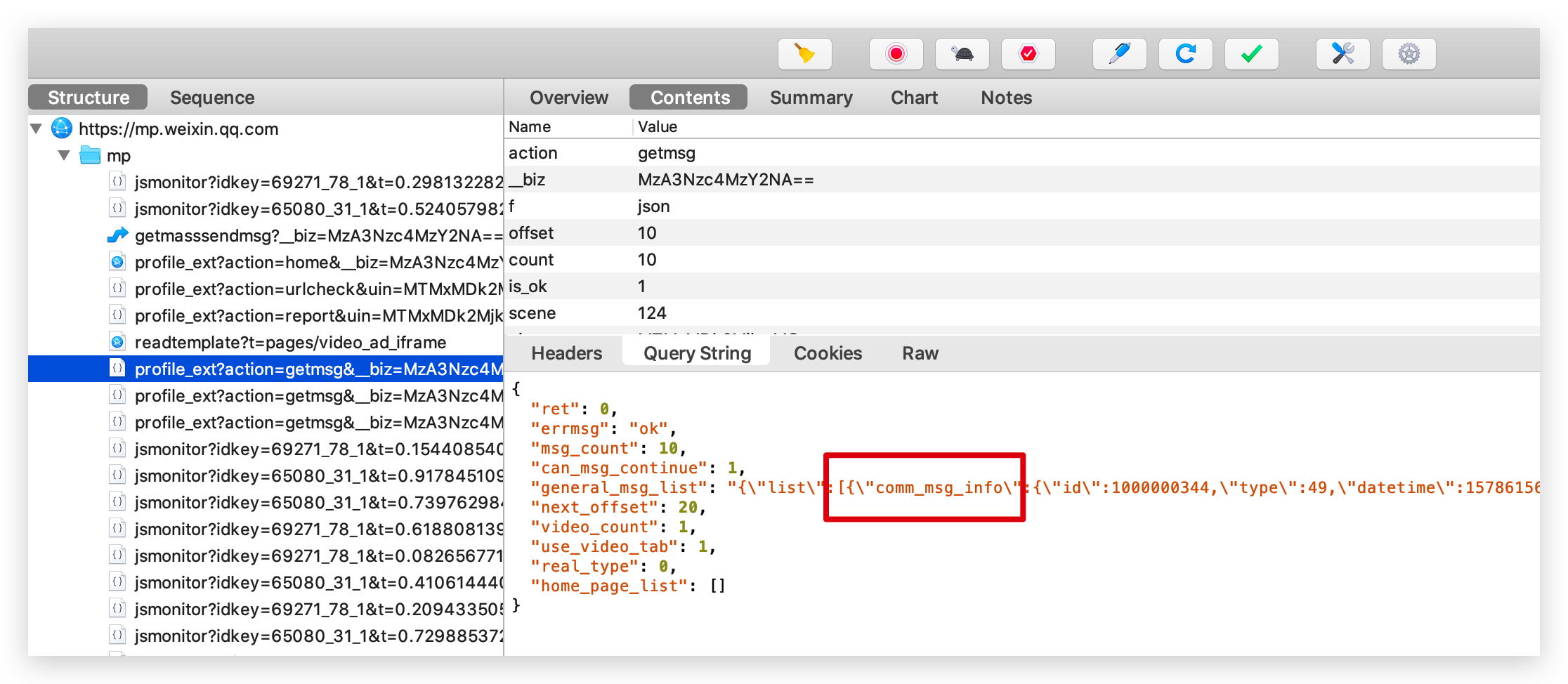 打开 PC 端微信,打开 「Python知识圈」公众号文章列表后,Charles 就会抓取到大量的请求,找到我们需要的请求,返回的 JSON 信息里包含了文章的标题、摘要、链接等信息,都在 comm_msg_info 下面。