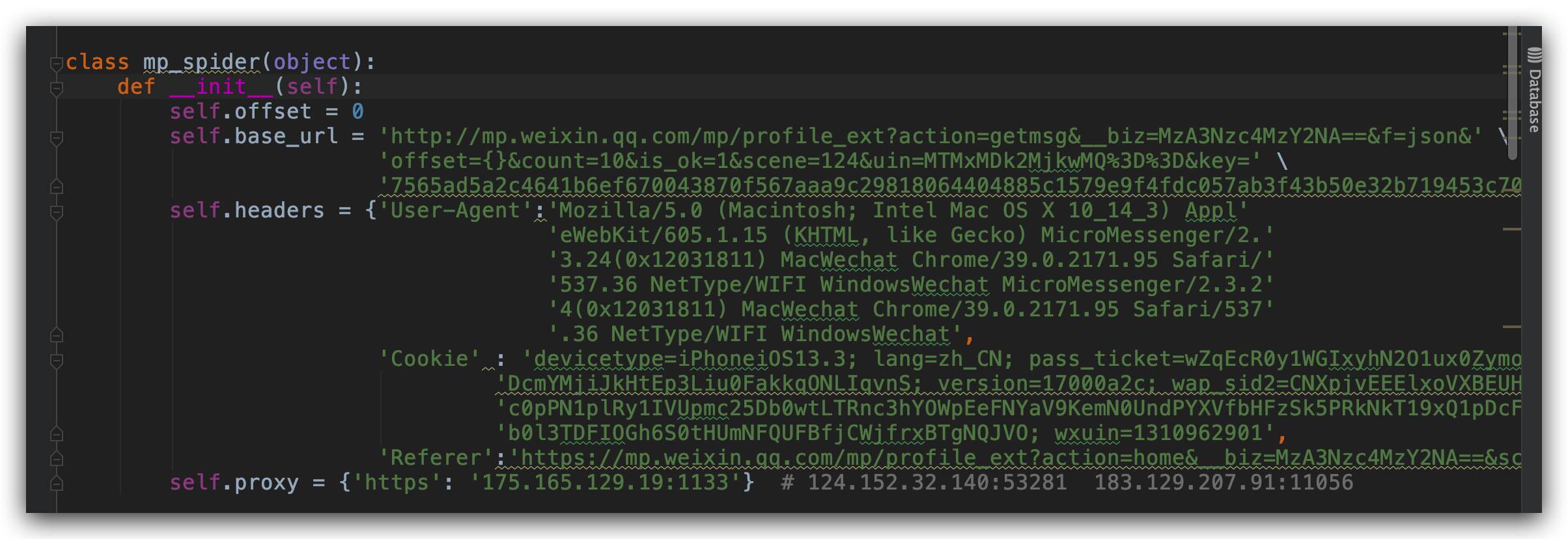 公众号历史文章列表向上滑动,加载更多文章后发现链接中变化的只有 offset 这个参数,我们创建一个初始化函数,加入代理 IP,请求头和信息,请求头包含了 User-Agent、Cookie、Referer。