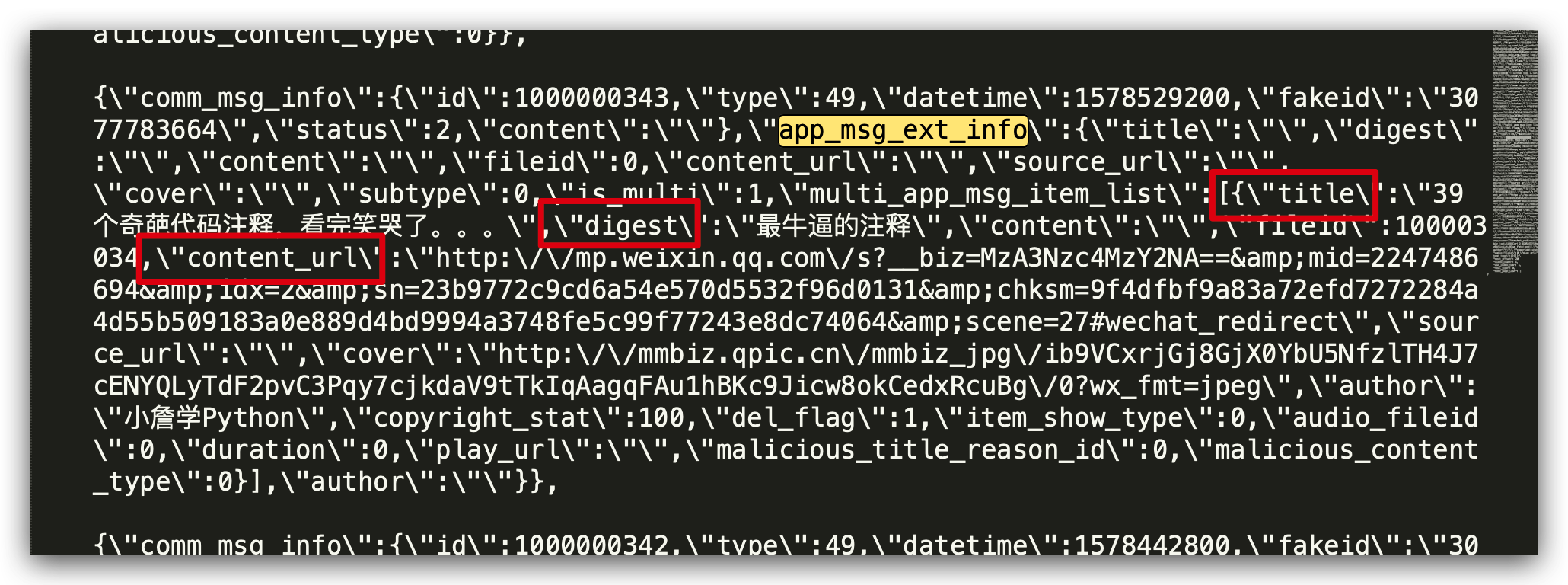 通过分析返回的 Json 数据,我们可以看到,我们需要的数据都在 app_msg_ext_info 下面。
