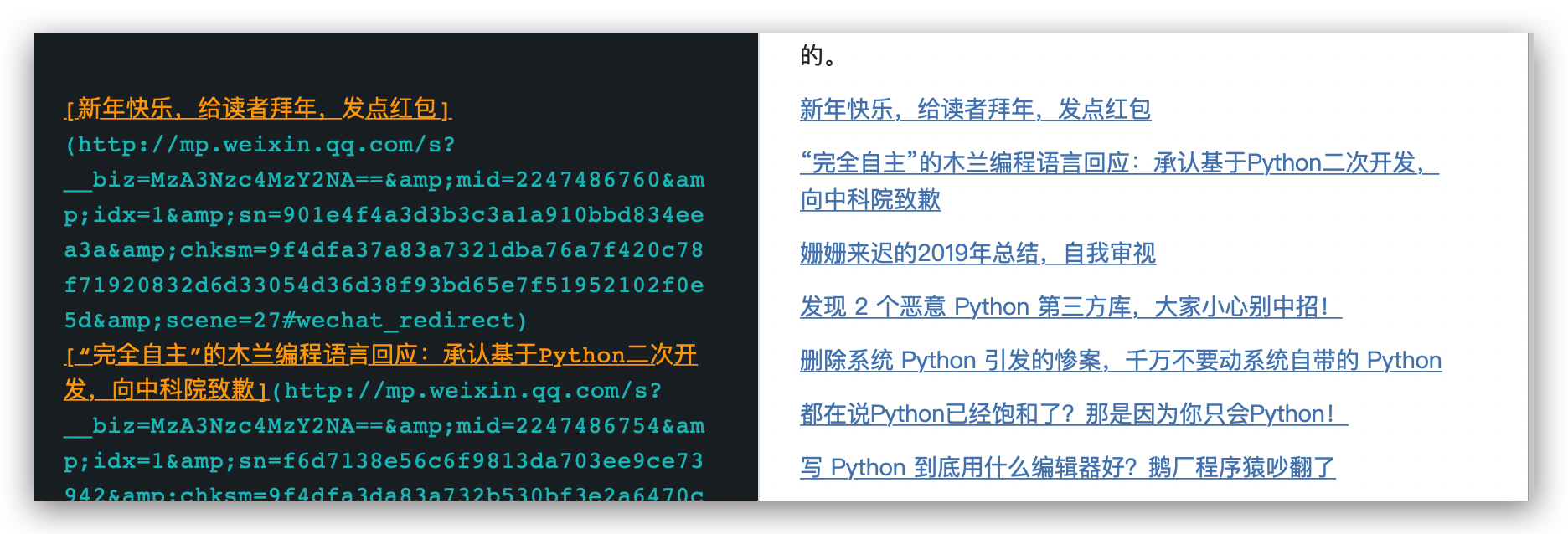 在 Markdown 格式里,用 [文章标题](文章url链接) 表示,所以我们保存信息时再加一列信息就行,标题和文章链接都获取了,Markdown 格式的 url 也就简单了。