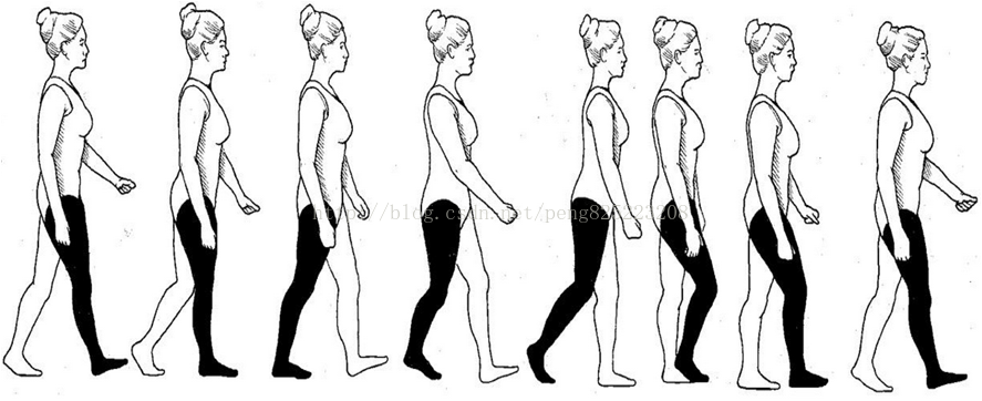 步态就是描述人走路特点的一种周期性现象,并且每个周期可以被分为多个部分进行分析。我们一般说的步态是指人类的行为方式,所以步态分析也是研究基本上也都是以人类为对象。附步态图一张。