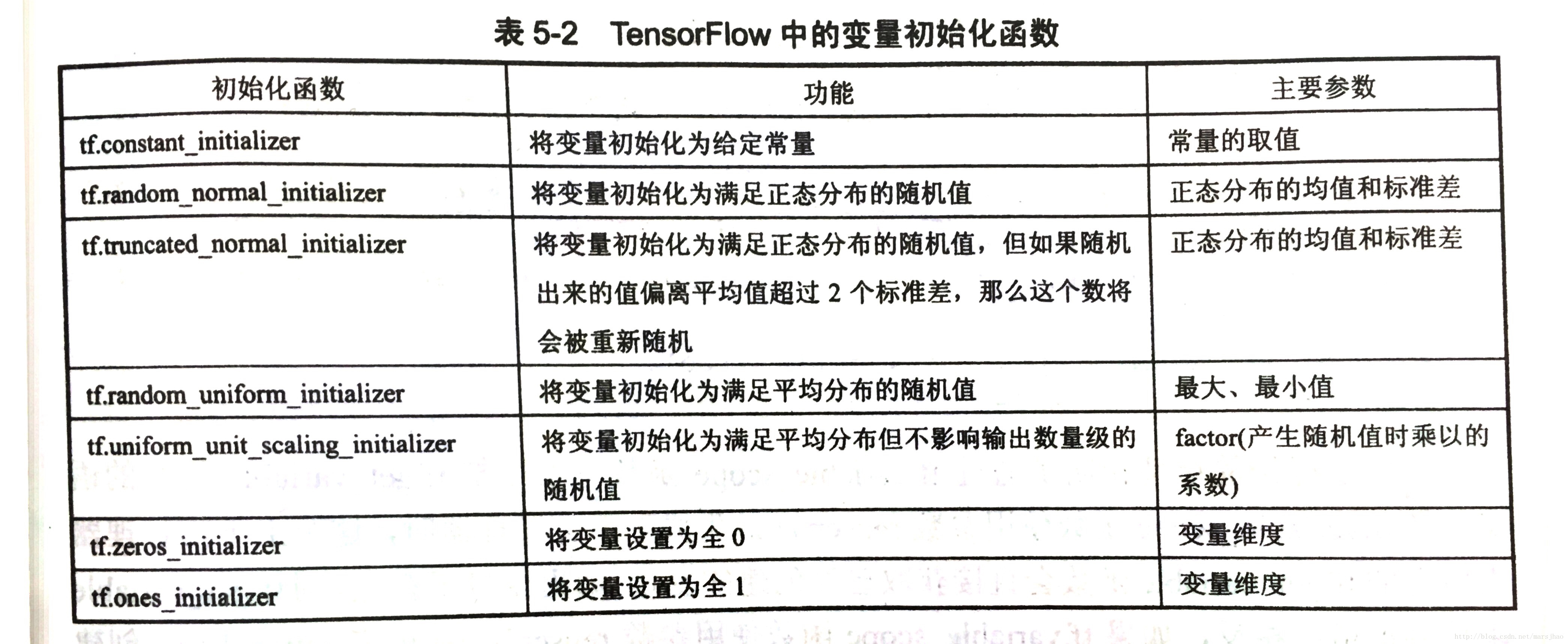 1. TensorFLow还提供了tf.get_variable函数来创建或者获取变量,tf.variable用于创建变量时,其功能和tf.Variable基本是等价的。tf.get_variable中的初始化方法(initializer)的参数和tf.Variable的初始化过程也类似,initializer函数和tf.Variable的初始化方法是一一对应的,详见下表。