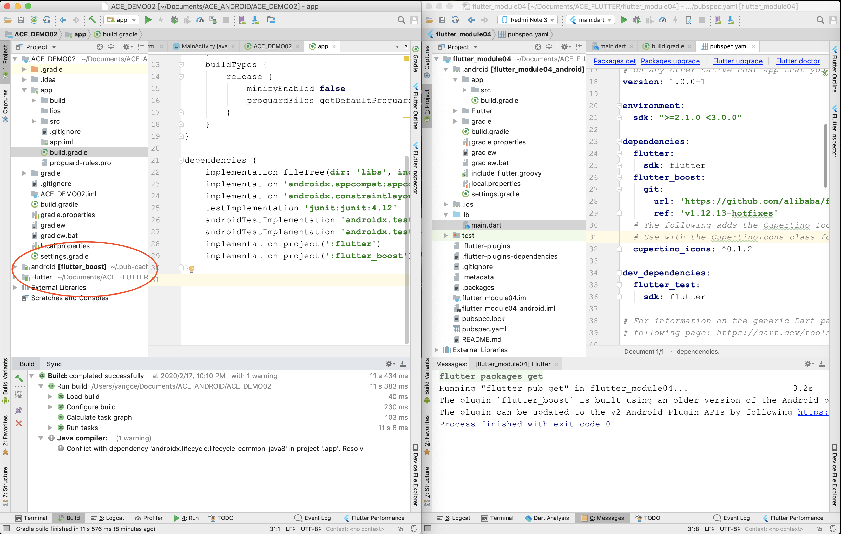 小菜将 Flutter Module 接入到 Android 工程中,方法不再赘述,注意 build.gradle 中需要加入 flutter 和 flutter_boost 两个依赖;Sync 之后 Project 中会加入 Flutter 和 FlutterBoost 模块;