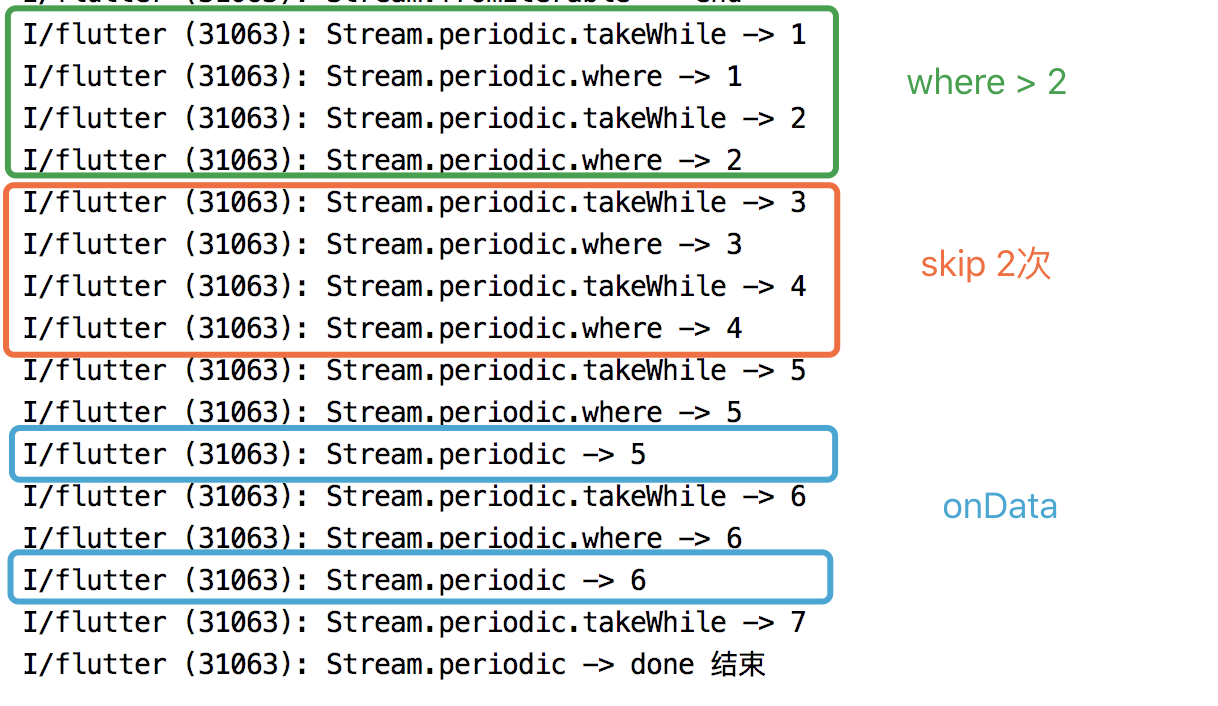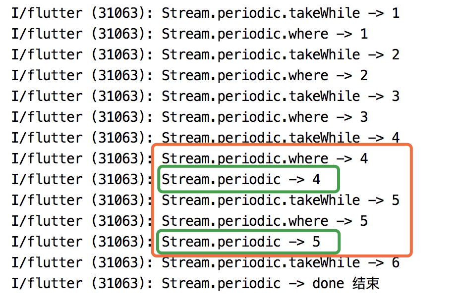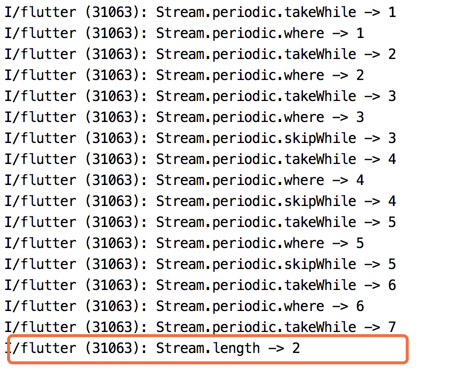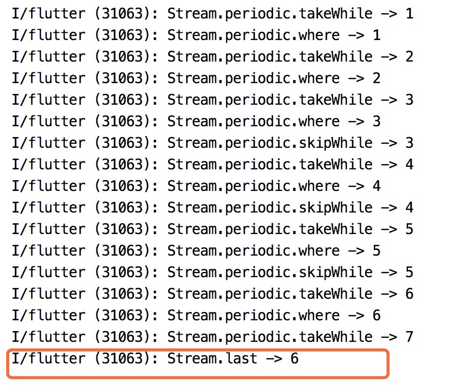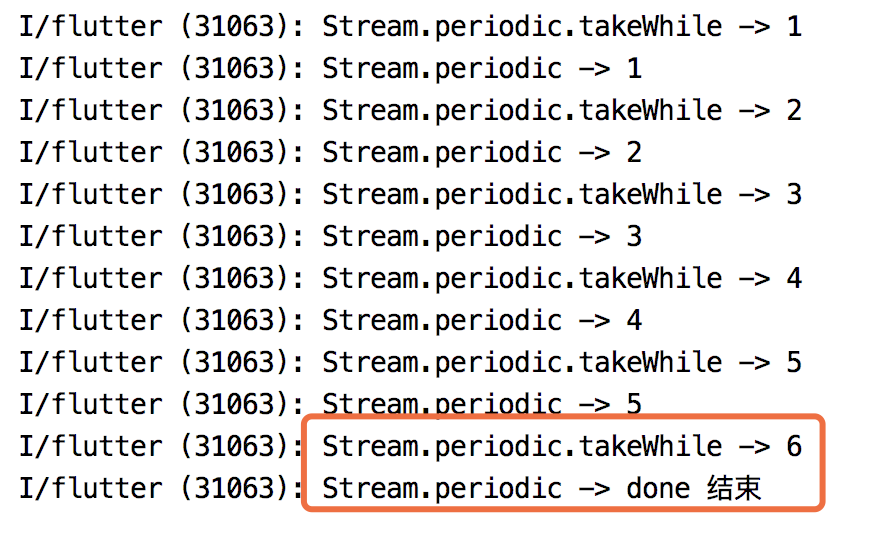 take() 对于单订阅方式,可以提供 take 设置之前的 Stream 订阅数据,例如设置中断 Stream.periodic 周期展示次数;小菜粗略理解为 take 可以作为中断订阅,如果 take 设置次数大于 onDone 之前的订阅数据次数,Stream 依旧获取所有 onDone 之前的订阅数据;