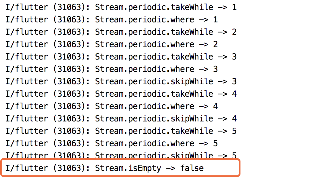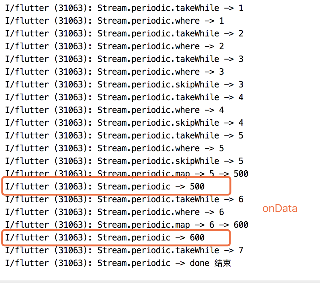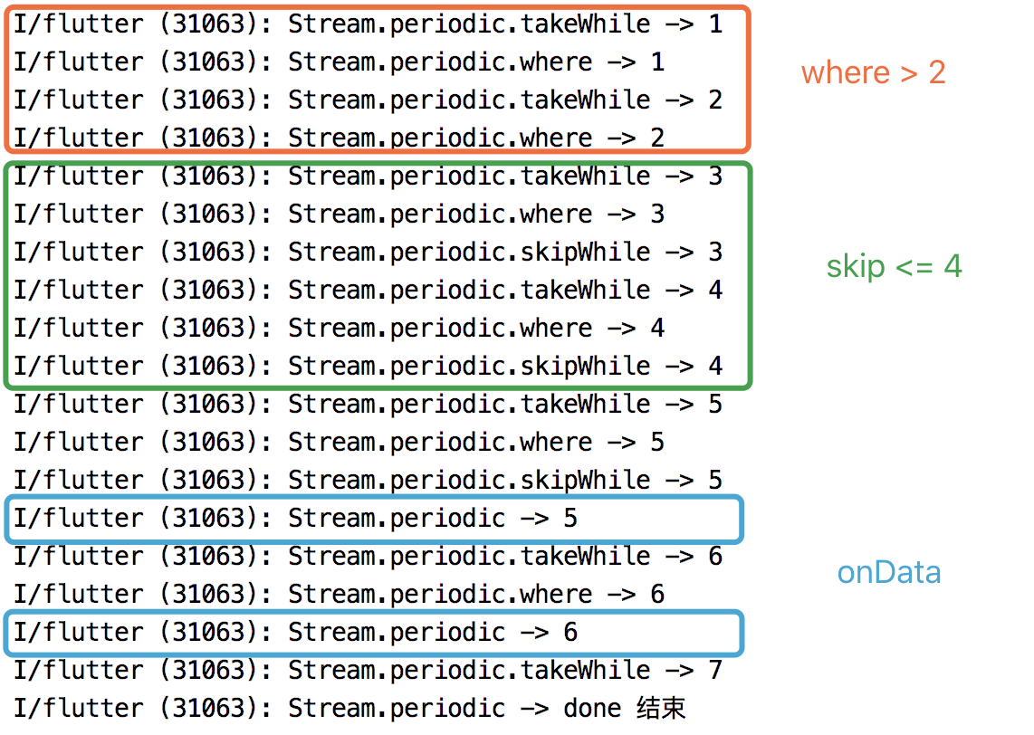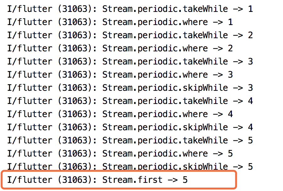 take() 对于单订阅方式,可以提供 take 设置之前的 Stream 订阅数据,例如设置中断 Stream.periodic 周期展示次数;小菜粗略理解为 take 可以作为中断订阅,如果 take 设置次数大于 onDone 之前的订阅数据次数,Stream 依旧获取所有 onDone 之前的订阅数据;