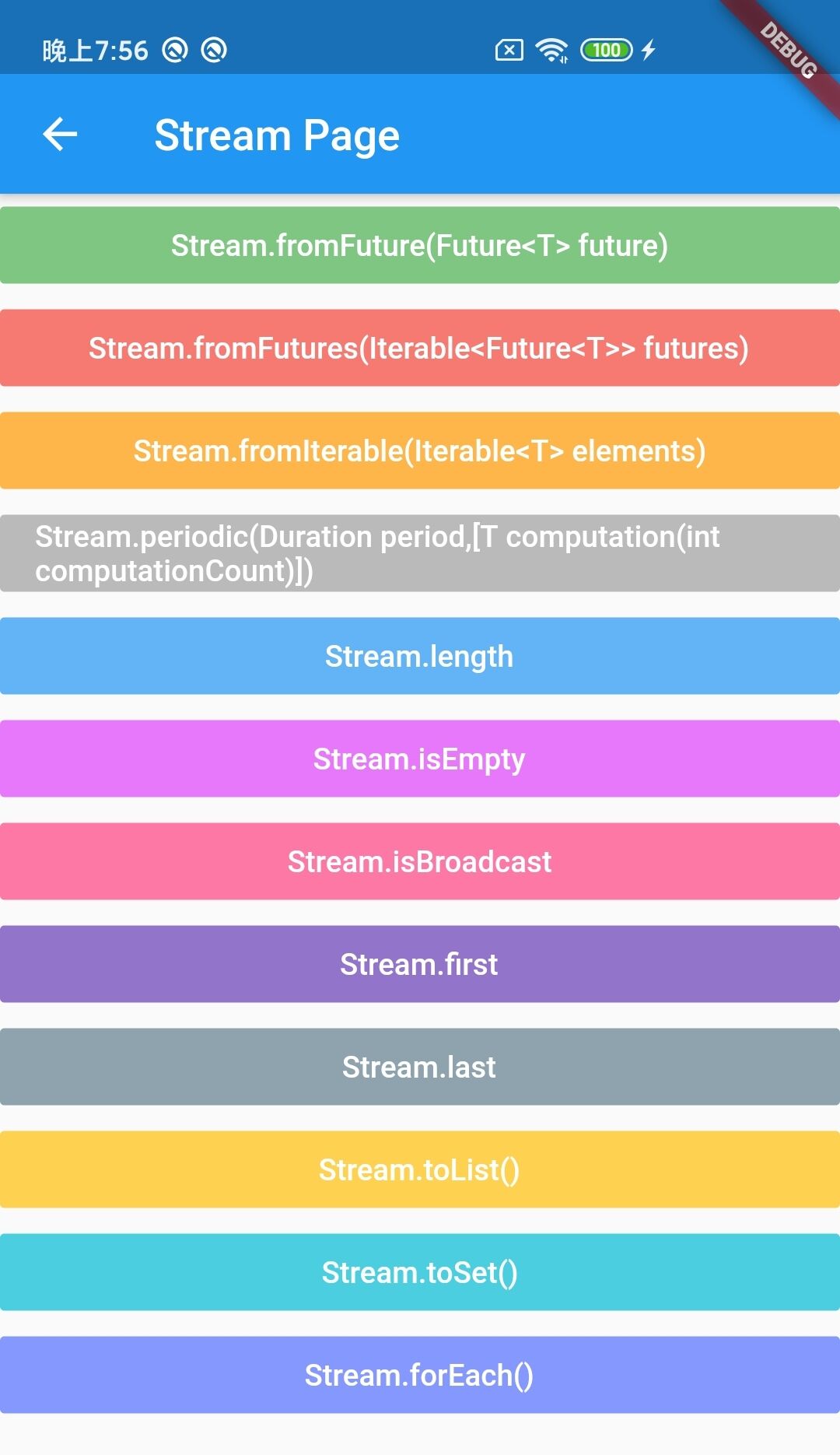 Stream 主要应用于 Flutter 的异步操作,在其他编程语言中也存在;Stream 提供了一种接受事件队列的方法,可通过 listen 进行数据监听,通过 error 接收失败状态,通过 done 来接收结束状态;