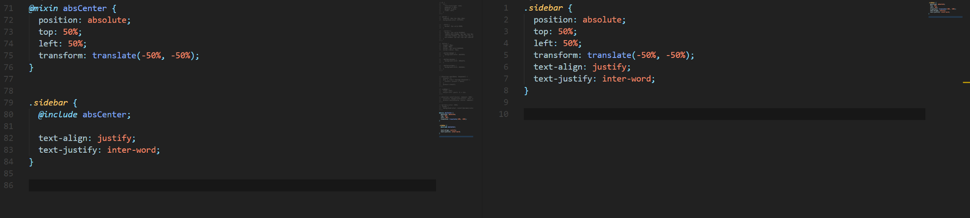 在左侧,我们有mixin absCenter,使用@include将它包含在.sidebar选择器中。生成的CSS中就会自动包括mixin的代码段了。