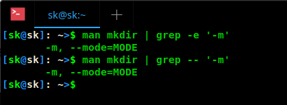 这个命令会显示出 mkdir 命令 man 页中第一次出现 -m 时的内容。从上面命令中我们可以看到 -m 表示的是 “MODE”(chmod)。