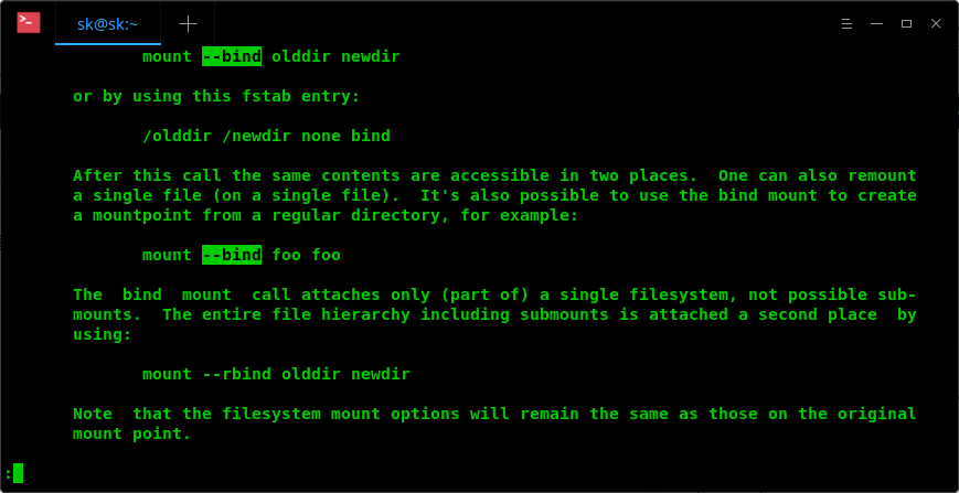 假设你正在查看 mount 命令的 man 页,想要寻找关于 -bind 选项的相关信息。可以输入:
