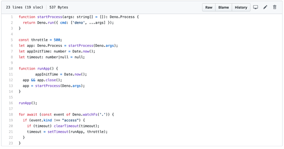 以Deno.watchFS向您提供的文件监视器API为例,如果你正在寻找类似于nodemon的解决方案,那么你可以自己构建它。下面是一个解决类似问题的23行脚本: